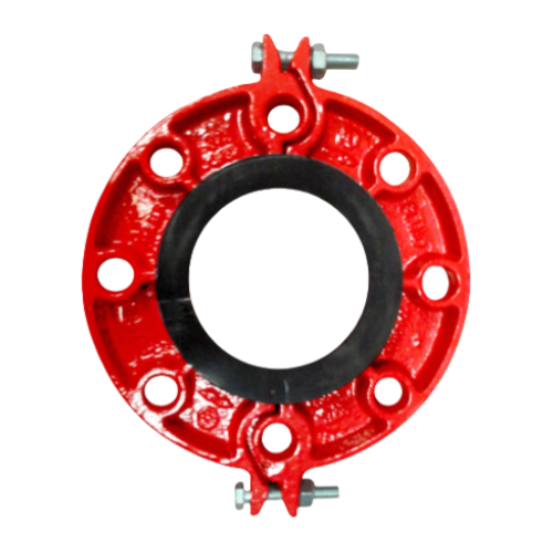 A flange bipartida ranhurada é uma conexão de tubulação usada para realizar a conversão entre tubos ranhurados e equipamentos com extremidades flangeadas. Ela funciona como uma "ponte", capaz de conectar tubos ranhurados a interfaces com flanges tradicionais, como válvulas, bombas d'água ou outros equipamentos, de forma rápida e sem solda.